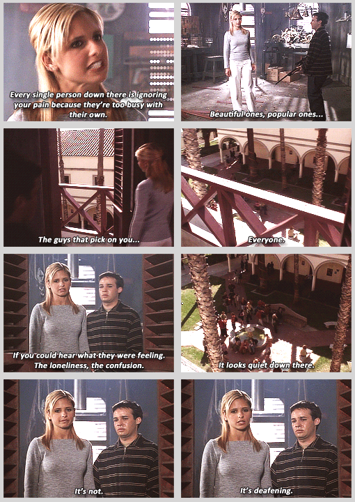 There’s a lot to be said about pain. We may think that ours is singular or unique but its not. Because all those people out there, the beautiful ones, the popular ones, the people who pick on you… they all have pain. We live in a digital, social world where we mostly see the highlights of other peoples lives which only emphasizes our perceived shortcomings. And all that just makes us feel more pain and more alone. We think everyone else has it all figured out. We think those people don’t have a care in the world. Wouldn’t it be great to be able to hear what’s really going on inside their heads like Buffy did? Then again… No. It would be horrible.